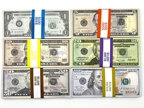 Prop Money Replica Bills – 600 Bills, All 6 Denominations ($1–$100)